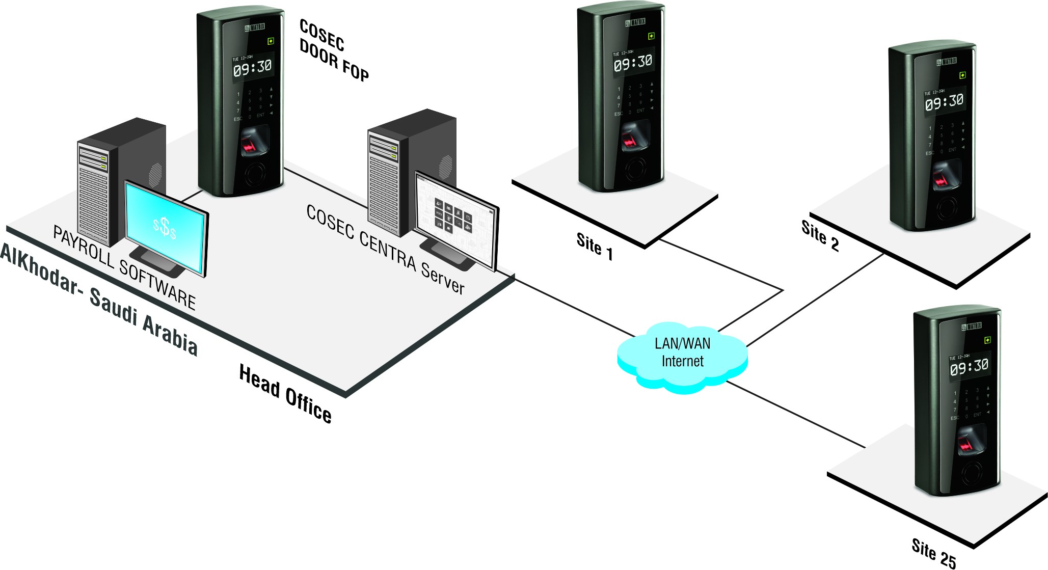 Al-Khodari is engaged in wide spread construction activities with 60 construction sites in the Middle East. Managing time-attendance, shifts, leaves and overtime of 20,000 employees at different locations is very time consuming and a tedious task. Previously, the customer was using Hand Geometry solution, which was very time consuming. Workers also found it difficult to place their palms in the proper position. Managing time-attendance data of all employees on a central level was also becoming difficult for the company. Furthermore, the head office was using a different time-attendance solution in comparison to other sites. The head office processed the salary of employees after receiving an attendance summary from each of their branches. The process of salary calculation with respect to working hours and overtime of each employee took around 10 days. Moreover, there were chances that the attendance data was inaccurate, leading loss of efficiency and employee dissatisfaction. To overcome such challenges, the company required a centralized time-attendance and access control solution which could be managed and controlled from the head office.