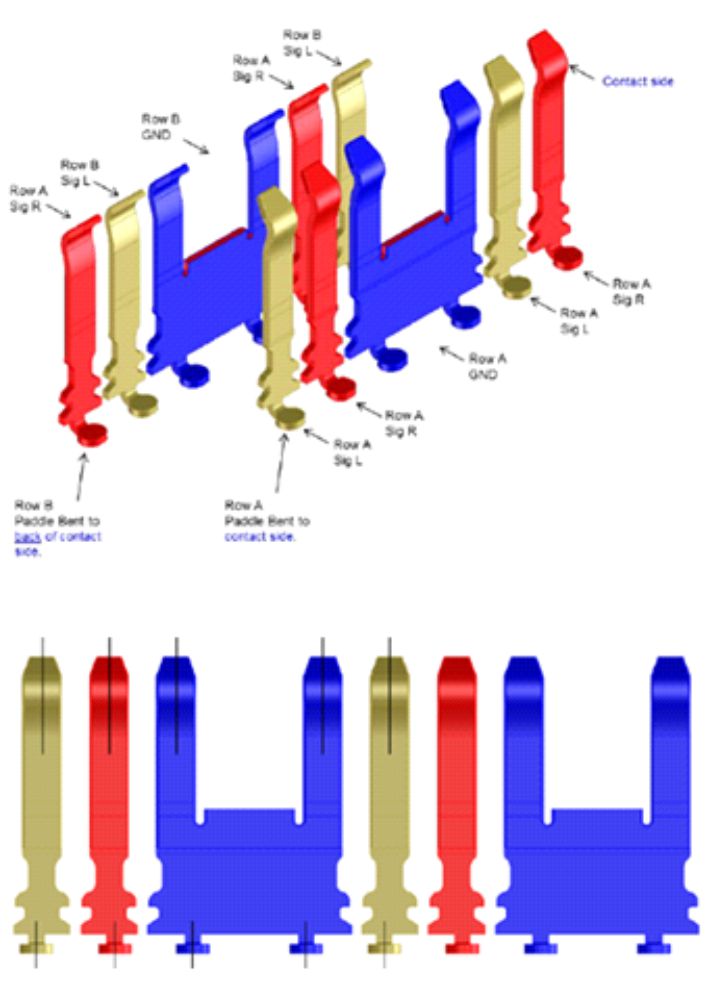 The bottom paddles and the centers of each contact point are at a slightly different pitch and offset from one another to further reduce crosstalk. This design of the pin configuration and corresponding signals illustrates the pattern found to optimize electrical characteristics. (Image courtesy of the Mirror Mezz datasheet.)