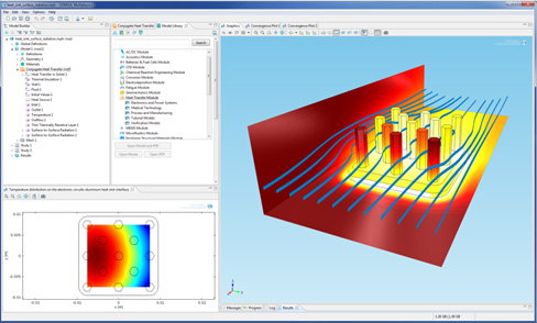 Figure 2: Overview of the COMSOL Desktop. Simulation of a common heat sink is shown, where fluid dynamics and heat transfer are coupled.