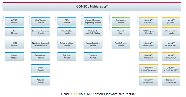 The architecture ofCOMSOL Multiphysics allows users to work in an integrated environment where any physics can be coupled in the same graphical user interface (GUI). This GUI is used throughout the simulation process—from defining the geometry,setting up the physics, creating the mesh, and finally to solvingand optimizing the results. In addition to the main product, COMSOL Multiphysics, there are several modules which address specific applications (see Figure 1). And of course, everyfeature added by the modules can be coupled with each other and combined with the base package.